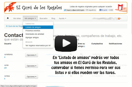 En el apartado "Listado de amigos" dentro de los CONTACTOS del botón "Mis amigos" aparecen los amigos con los que compartes algo en El Gurú de los Regalos. Si es tu amigo, quiere decir que verá tus listas siempre que estén publicadas y que sepa las contraseñas de las privadas. Si eres su amigo, significa que te ha dado permiso para ver sus listas publicadas.