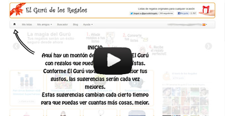 "Inicio" es la página principal, el escaparate del Gurú. En él verás diversas sugerencias de regalo que pueden ser de tu gusto a la hora de confeccionar listas. Conforme el Gurú vaya conociéndote mejor, irá afinando la categoría de regalos que mostrarte.