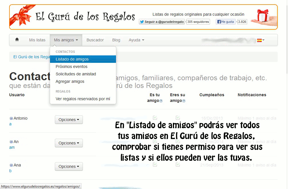 En el apartado "Listado de amigos" dentro de los CONTACTOS del botón "Mis amigos" aparecen los amigos con los que compartes algo en El Gurú de los Regalos. Si es tu amigo, quiere decir que verá tus listas siempre que estén publicadas y que sepa las contraseñas de las privadas. Si eres su amigo, significa que te ha dado permiso para ver sus listas publicadas.