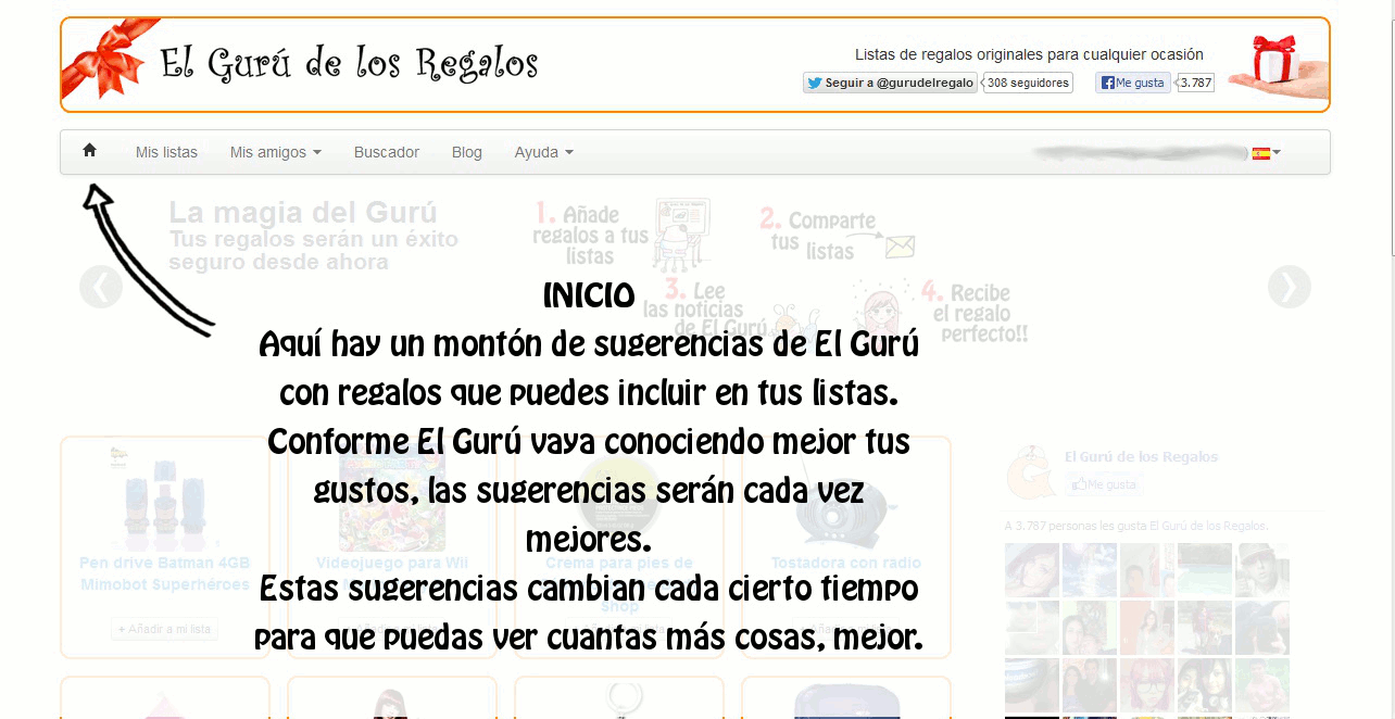 "Inicio" es la página principal, el escaparate del Gurú. En él verás diversas sugerencias de regalo que pueden ser de tu gusto a la hora de confeccionar listas. Conforme el Gurú vaya conociéndote mejor, irá afinando la categoría de regalos que mostrarte.